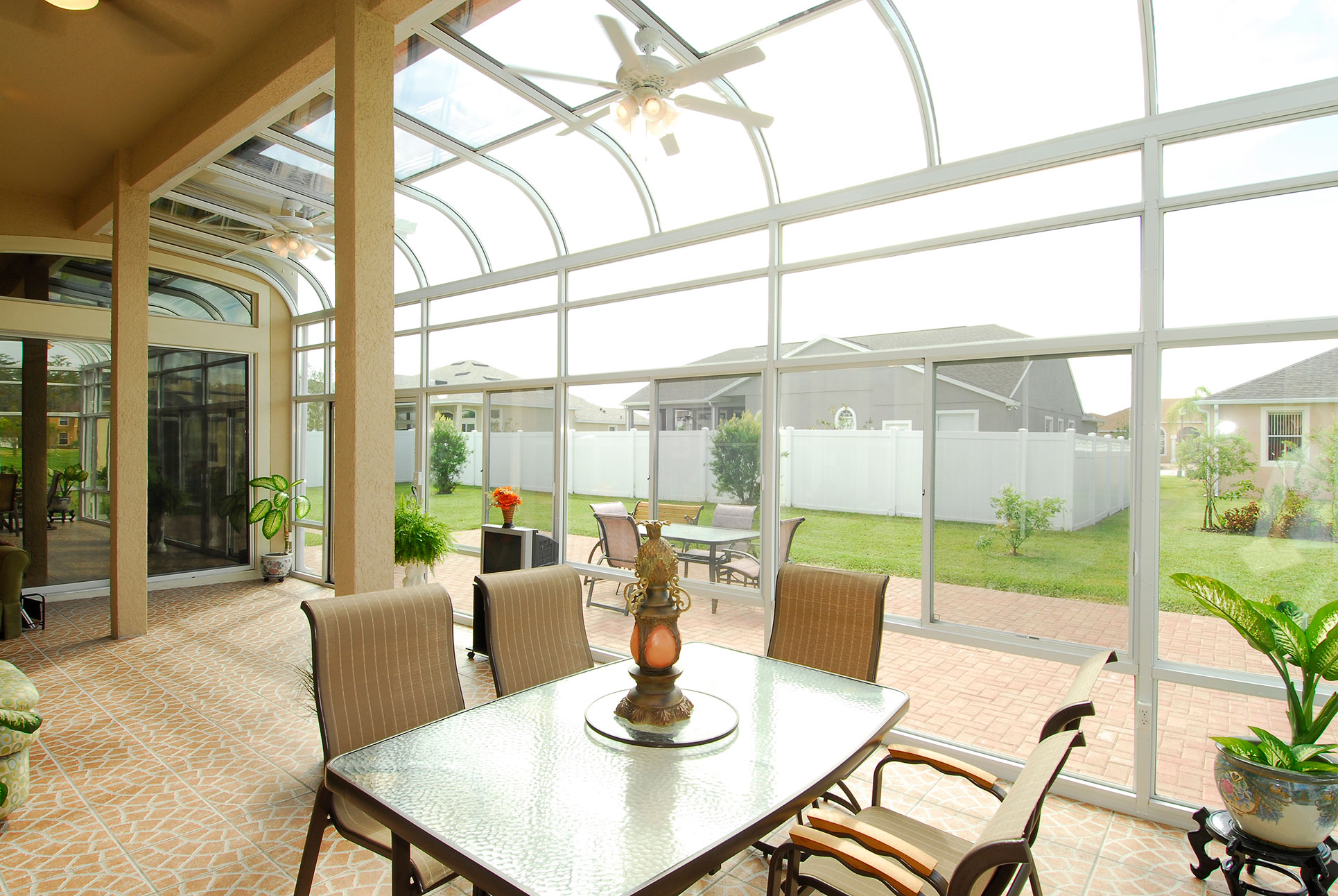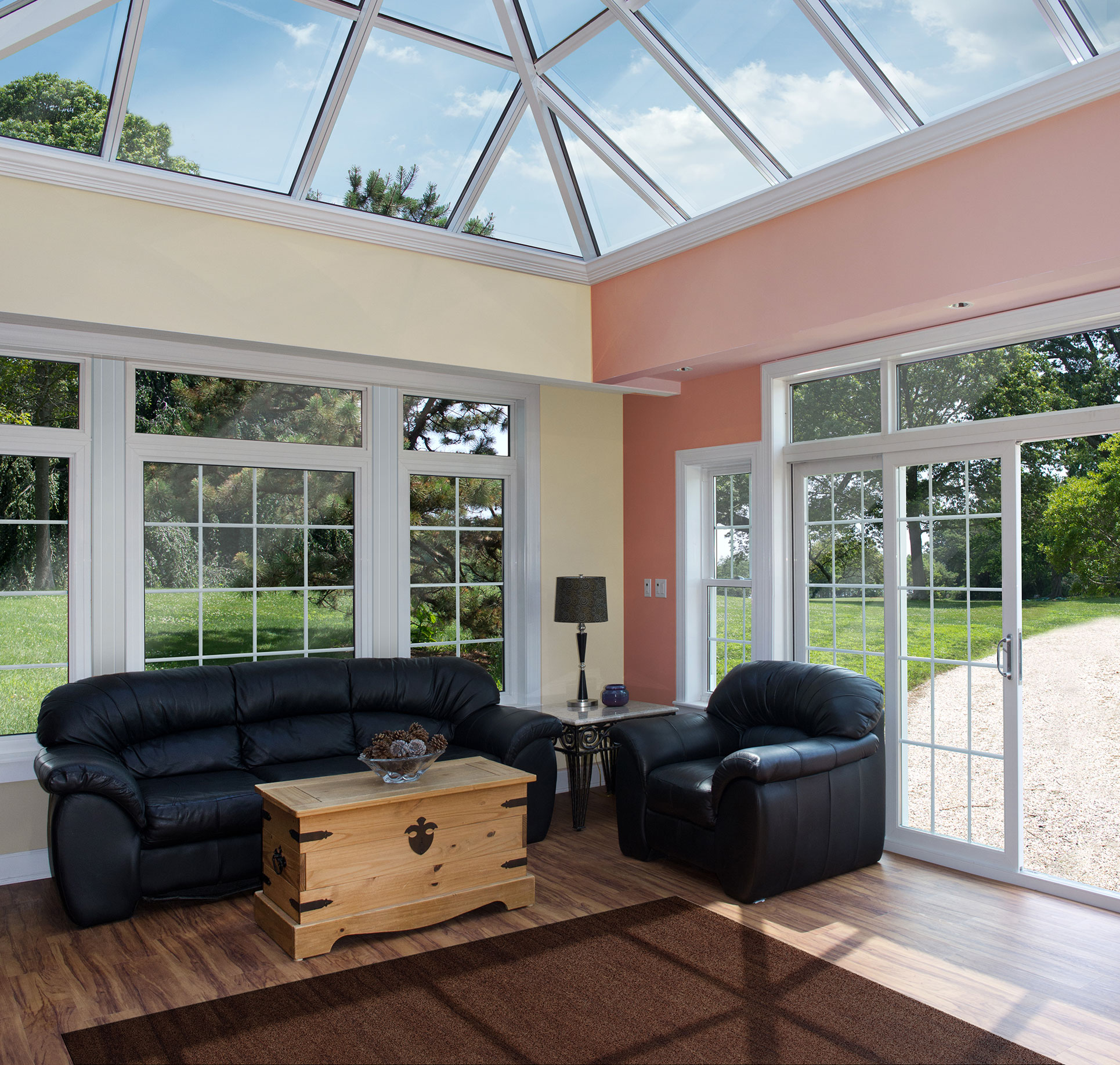 Our more modern straight eave ceiling design is equally impressive and elegant offering clean, straight lines and luxury to your living space. Choose a Sun and Shade Glass Sunroom (with an insulated, solid roof) or a Sun and Stars Glass Sunroom (with a ConservaGlass Select roof) – both provide year-round comfort and energy efficiency.